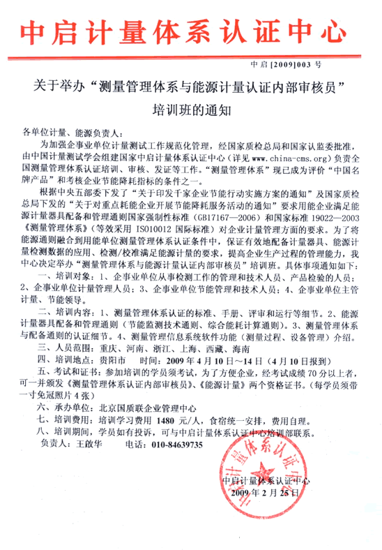 关于举办“测量管理体系与能源计量认证内部审核员”培训班的通知